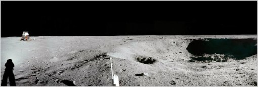MOONSCAPE The Sea of Tranquillity and its gaping craters dwarfed the shadow of Neil Armstrong at lower left. The Eagle lander is in the background.