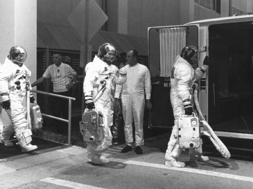 In the early light of dawn, the three Apollo 11 astronauts take the drive from their quarters to the launching pad. Everything is on schedule for a liftoff at 9:32 a.m.