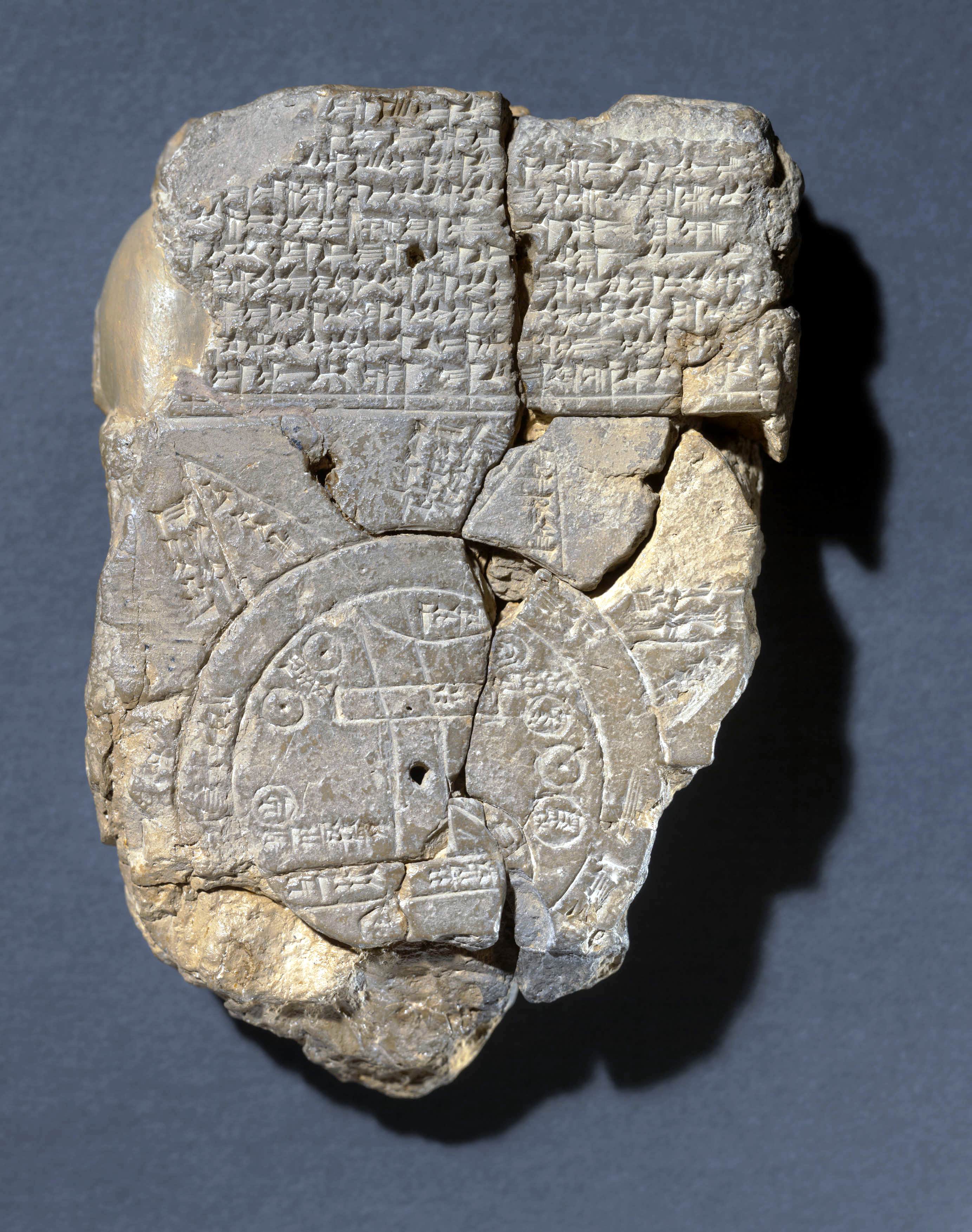 Esta tábua contém, simultaneamente, uma inscrição cuneiforme e um mapa sem igual do mundo da Mesopotâmia. Babilónia é mostrada ao centro (retângulo na metade superior do círculo), bem como Assíria e Elam, centros do Império. A área central é circundada por uma inscrição aquática, “Mar Salgado”. A parte exteriro do círculo é rodeada pelo que, provavel e originalmente, foram oito regiões, cada uma identificada por um triângulo, designado “Região” ou “Ilha‘’, e marcadas com a distância entre si. O texto cuneiforme que descreve estas regiões (semelhante a uma criatura mítica) está incompleto.
