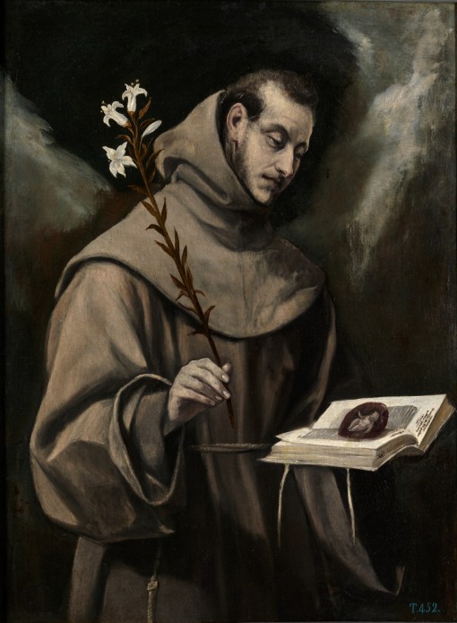 Esta es la única ocasión en la que el Greco representó a San Antonio de Padua (1195-1231), una de las grandes figuras de la espiritualidad franciscana. El de Padua aparece en primer término y en imagen de algo más de medio cuerpo, sosteniendo una rama de lirios o azucenas, y un libro abierto sobre cuyas páginas emerge una representación del Niño Jesús. Esta imagen, que haría alusión a la aparición milagrosa del Niño, se inscribe de forma bastante extraña en una suerte de medallón que fue incorporado más tardíamente a la pintura, como demuestra la radiografía de la obra. Hay que tener en cuenta además que la tela procede de un convento femenino, el de franciscanas de los Ángeles, en Madrid; las franciscanas siempre se han caracterizado por la devoción al Niño Jesús. El trazado piramidal, la corpulencia y sentido monumental de la figura, así como la construcción pictórica y el tipo de firma en mayúsculas son características del periodo inicial en España. Via.