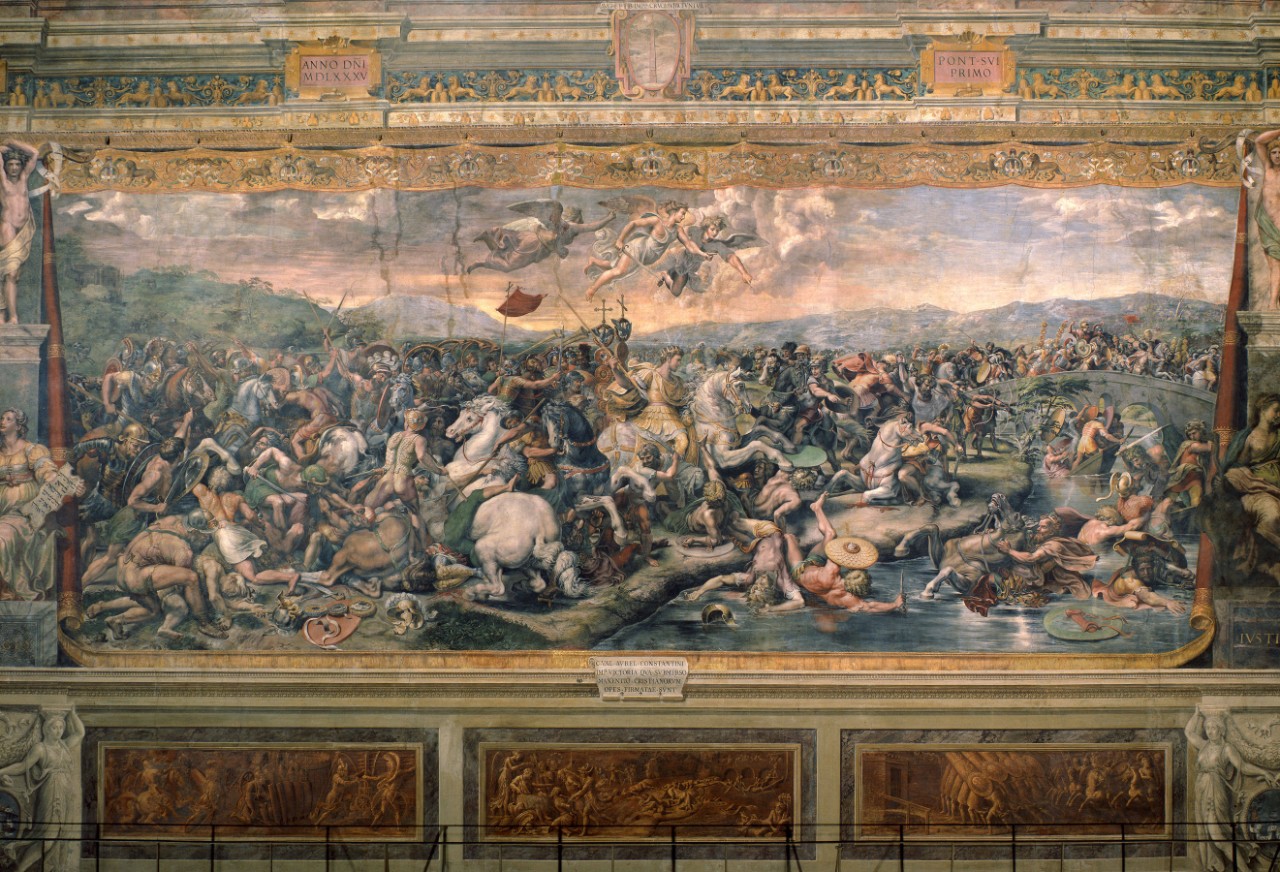 The Battle of the Pons Milvius (312 A.D.) placed Constantine against his rival, marking the defeat of Maxentius (shown as he is about to drown in the river Tiber) and the victory of Christianity over the pagan world. The scene is set with topographical precision north of Rome with Monte Mario (on the left) where we can recognize Villa Madama, built in just those years by Raphael for the Pope. The initial project for this panel, as for the Vision of the Cross, must certainly have been by Raphael, but its execution is by his pupil Giulio Romano.