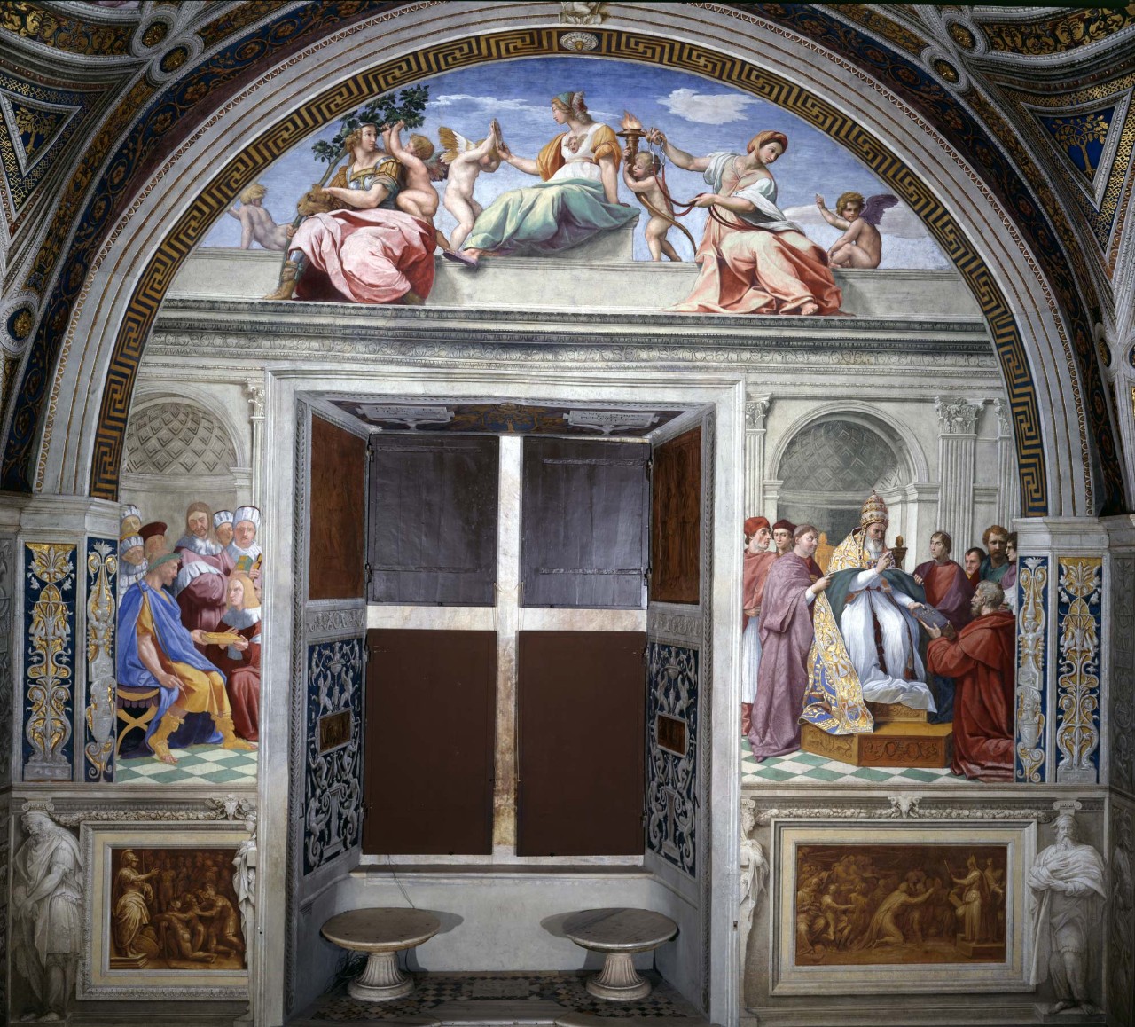 On the wall opposite the Parnassus, corresponding to Justice, is an illustration of the Cardinal Virtues (Fortitude, Prudence and Temperance) and the Theological Virtues (Faith, Hope and Charity) in the lunette above, and below, at the sides of the window, the Delivery of the Pandects to the Emperor Justinian (on the left) and the Delivery of the Decretals to Pope Gregory IX. The pontiff is a portrait of the Pope who had commissioned the work, Julius II (pontiff from 1503 to 1513), while the cardinals beside him are Giovanni de’ Medici and Alessandro Farnese, the future Popes Leo X (pontiff from 1513 to 1521) and Paul III (pontiff from 1534 to 1549). The painting of the Delivery of the Pandects to the Emperor Justinian is by Lorenzo Lotto.