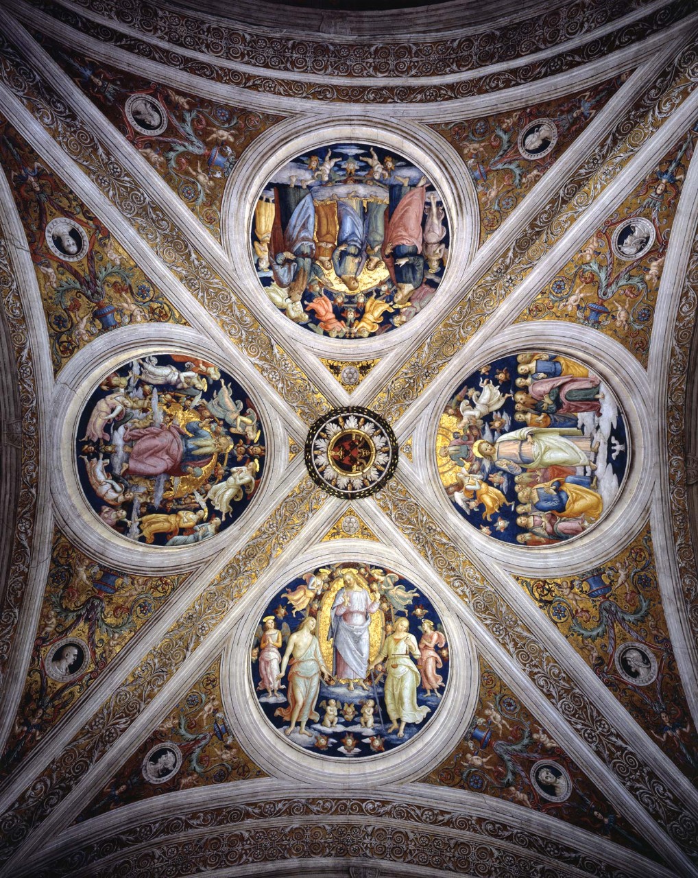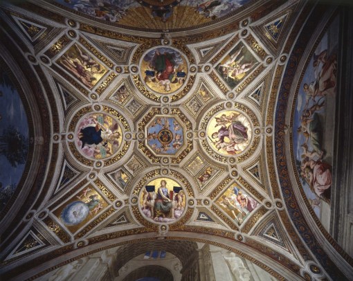 In 1508 Julius II (pontiff from 1503 to 1513) commissioned Pietro Vannucci, called the Perugino, to paint the ceiling. Its iconographic plan refers to the function that the room had at the time of Julius II when it hosted the meetings of the highest court of the Holy See, the Segnatura Gratiae et Iustitiae, which was presided over by the pontiff. In fact Perugino depicted in the four medallions the Most Holy Trinity, the Creator enthroned among angels and cherubs, Christ as Sol Iustitiae and Christ tempted by the devil, and Christ between Mercy and Justice.