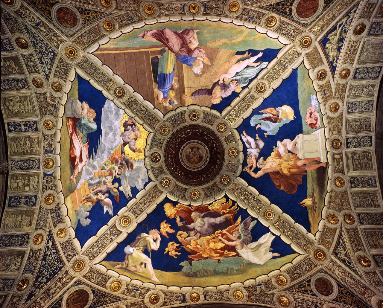 In the grotesques and in the arches there are still some parts that can be attributed to Luca Signorelli, Bramantino, Lorenzo Lotto and Cesare da Sesto. They date to the first decoration commissioned by Julius II at the beginning of his pontificate, that was interrupted and then replaced by the present one due to the pontiff’s great admiration for the first frescoes of Raphael in the adjoining Room of the Segnatura. Raphael replaced the grotesques in the centre of the ceiling with four episodes of the Old Testament: Noah leaving the ark (Genesis 8: 15-20), The sacrifice of Isaac (Genesis 22: 1-14), Moses before the burning bush (Exodus 3: 1-12), and Jacob’s dream (Genesis 28: 10-22).