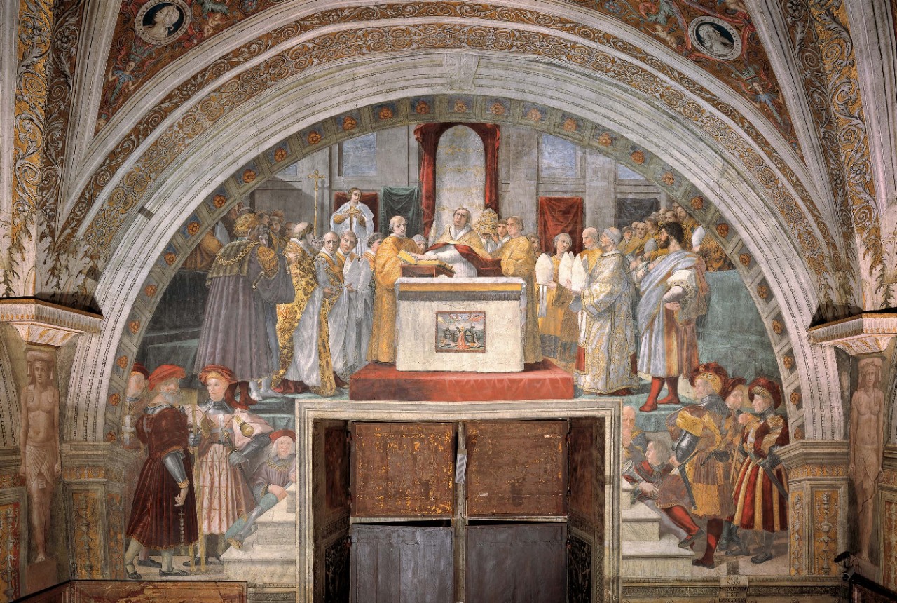 The encounter between Leo the Great and Attila is the last fresco painted in this room. It was completed after the death of Julius II (pontiff from 1503 to 1513), during the pontificate of his successor Leo X (pontiff from 1513 to 1521). In fact the latter appears twice in the same scene, portrayed in the guise of Pope Leo the Great and as cardinal. According to legend, the miraculous apparition of Saints Peter and Paul armed with swords during the meeting between Pope Leo the Great and Attila (452 A.D.) caused the king of the Huns to desist from invading Italy and marching on Rome. Raphael situates the scene at the gates of Rome, identified by the Colosseum, by an aqueduct, an obelisk and other buildings, even if in fact the historical event took place in the north of Italy, near Mantua.