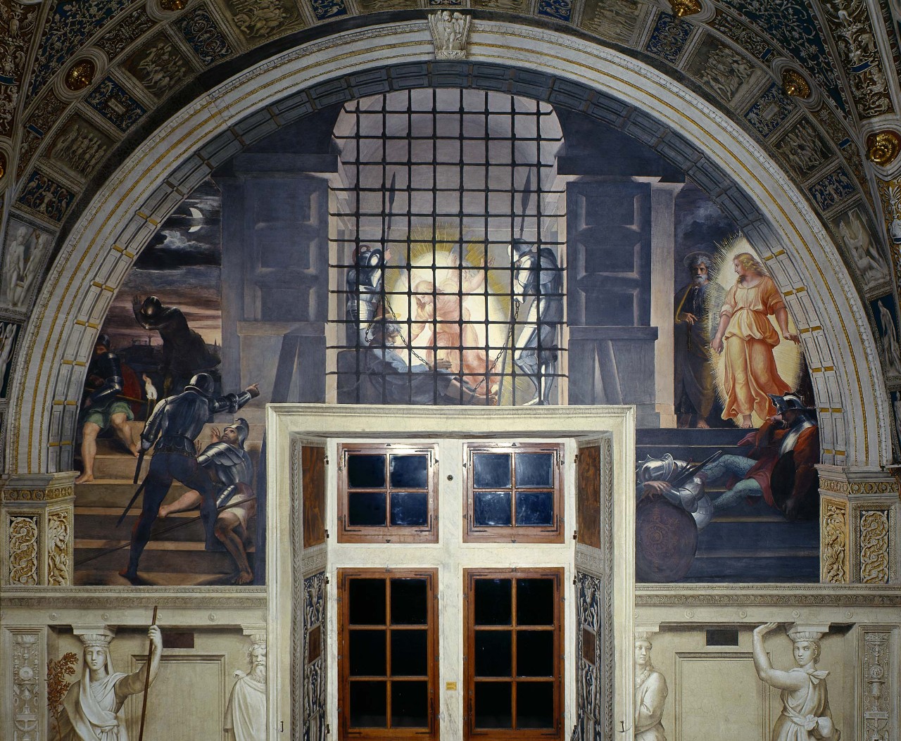 The Liberation of St Peter shows the prince of the apostles and first Pope, miraculously saved from prison by an angel while the guards lie sleeping (Acts of the Apostles 12: 5-12). The scene is a reference to Julius II (pontiff from 1503 to 1513), who before being elected Pope was the titular cardinal of St Peter in Chains. In the celebration of light Raphael confronts the divine light of the angel with that of the dawn, of the moon, of the torches and of their reflections on the armour, and even of the natural light that enters from the window below, creating the most extraordinary effects.