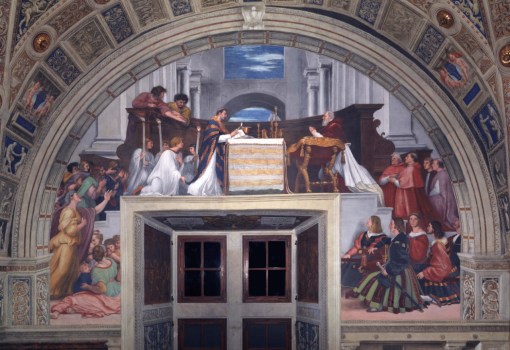 The Mass of Bolsena depicts an episode that took place in 1263 in Bolsena, near Orvieto. During the Mass celebrated by a Bohemian priest, at the moment of consecration the blood of Christ trickled from the host, staining the corporal and thus dismissing the doubts of the celebrant on transubstantiation (that is to say the changing of the substance of the bread and wine into that of the body and blood of Christ in the Eucharist). The miracle led to the establishment of the feast of Corpus Christ and the construction of the cathedral of Orvieto, to which the corporal was transferred. Julius II (pontiff from 1503 to 1513), witnesses the miracle kneeling to the right of the altar, with cardinals Leonardo Grosso della Rovere and Raffaello Riario, Tommaso Riario and Agostino Spinola, his relatives and the chair bearers of the group.
