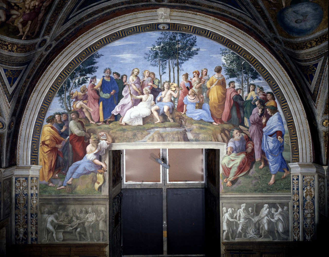 Beneath Poetry, Mount Parnassus is represented: the god Apollo, seated at the centre, plays the lyre surrounded by the nine Muses, protectresses of the arts, and by ancient and modern poets, among whom Homer (blind), Virgil and Dante are easily recognisable behind him, as well as the poetess Sapphos seated at the bottom left, with her name written on the scroll she holds in her left hand.