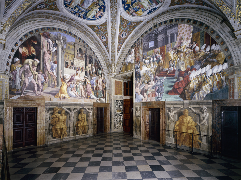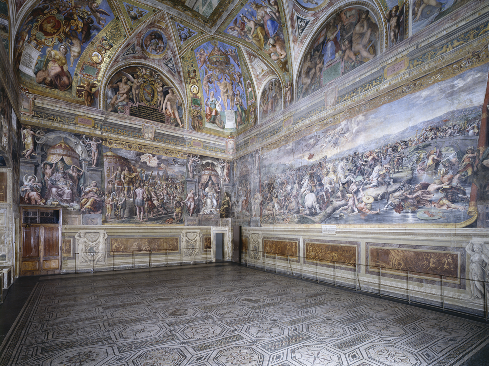 The room, that was designed to be used for receptions and official ceremonies, was decorated by the school of Raphael on the basis of drawings by the artist, who died prematurely before completion of the work (1520). It takes its name from Constantine (306-337 A.D.), the first Christian emperor to officially recognize the Christian faith, granting freedom of worship. On the walls are painted four episodes of his life which testify to the defeat of paganism and the triumph of the Christian religion: the Vision of the Cross, the Battle of Constantine against Maxentius, the Baptism of Constantine and the Donation of Rome. The decoration of the room is completed by figures of great Popes flanked by allegorical figures of Virtue. The original wooden roof which Leo X (pontiff from 1513 to 1521) had built was replaced under Gregory XIII (pontiff from 1572 to 1585) by the modern ceiling, the decoration of which was entrusted by order of the Pope to Tommaso Laureti who portrayed the Triumph of the Christian religion in the central panel. The work was completed at the end of 1585 under Pope Sixtus V (pontiff from 1585 to 1590).