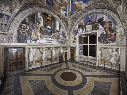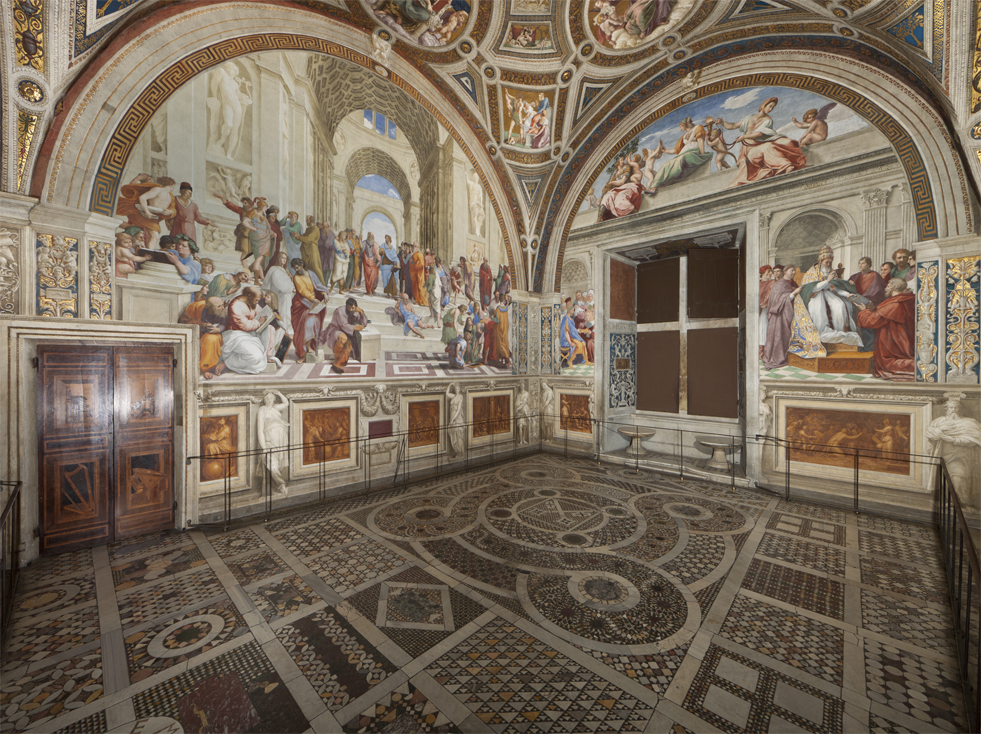 The four rooms known as the Stanze of Raphael formed part of the apartment situated on the second floor of the Pontifical Palace that was chosen by Julius II della Rovere (pontiff from 1503 to 1513) as his own residence and used also by his successors. The pictorial decoration was executed by Raphael and his school between 1508 and 1524.