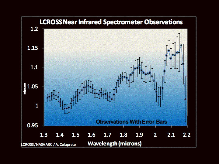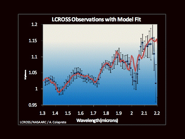 The team took the known near infrared spectral signatures of water and other materials and compared them to the spectra collected by the LCROSS near infrared spectrometer of the impact.