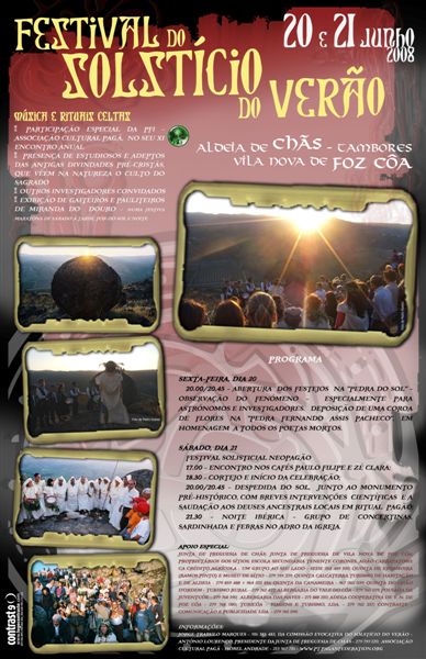 Este ano, celebremos a Roda do Sol a antigas divindades locais, com o Paganismo Ibérico, pela PFI-Associação Cultural Pagã, a realizar ao entardecer do dia 21 Junho 2008, em Trás-os-Montes, no Santuário rupestre da Aldeia de Chãs, no Concelho de Vila Nova do Foz Côa, cuja participação é a convite da comissão de Festas local e da Junta Freguesia de Chás.
