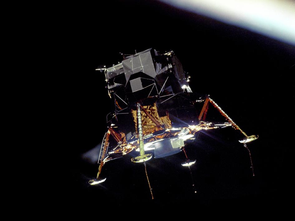The Eagle Prepares to Land The Apollo 11 Lunar Module Eagle, in a landing configuration was photographed in lunar orbit from the Command and Service Module Columbia. Inside the module were Commander Neil A. Armstrong and Lunar Module Pilot Buzz Aldrin. The long rod-like protrusions under the landing pods are lunar surface sensing probes. Upon contact with the lunar surface, the probes sent a signal to the crew to shut down the descent engine. Image Credit: NASA