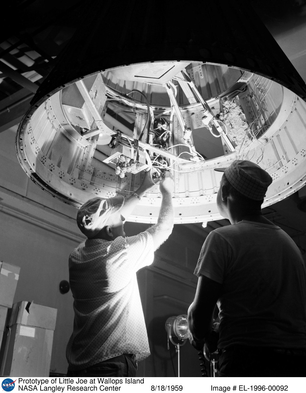 Design of the Little Joe capsules began at Langley prior to the design of the Mercury capsule and was, therefore, a separate design. It was not designed to carry a man but the capsules did have to meet the weight and center of gravity requirements of Mercury and withstand the same aerodynamic loads during the path of lift-off. In comparison with the overall Mercury Project, Little Joe was a simple undertaking, The fact that an attempt was made to condense a normal two-year project into a six-month one with in-house labor turned it into a major undertaking for Langley.