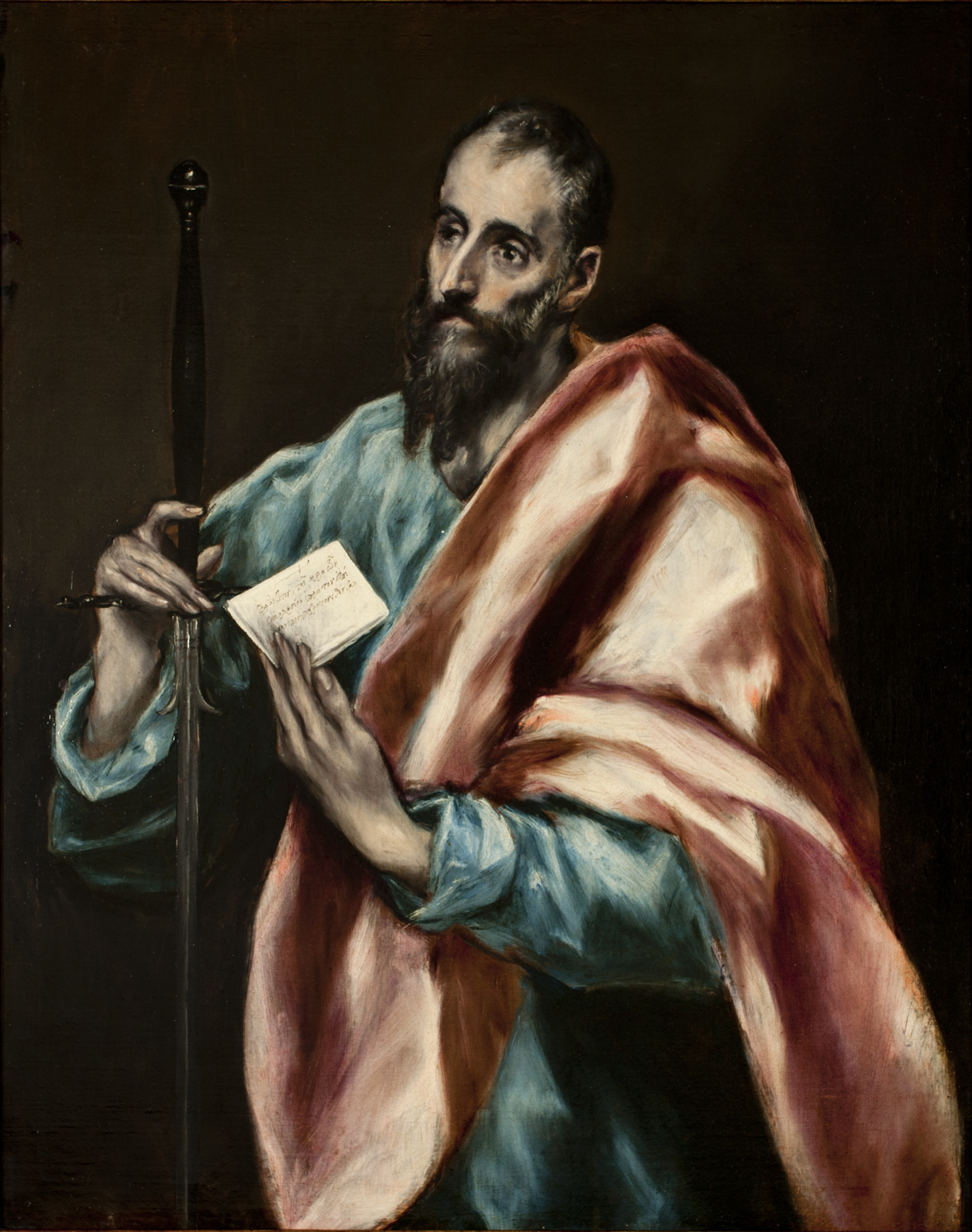 Es una de las imágenes más bellas de la serie y aparece firmada en la espada con el nombre completo del artista. La espada representa el instrumento con que fue decapitado y con la que se asocia al santo desde el siglo XIII, y la carta, escrita en griego, contiene el principio de su Epístola a su discípulo Tito: “A tito primer obispo ordenado de la iglesia de los cretenses”. En todas sus series apostólicas el Greco incluye a Pablo que, pese a no ser uno de los apóstoles canónicos, se autoproclamó “Apóstol de los Gentiles”.