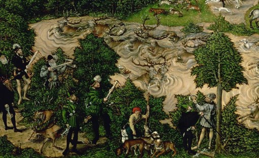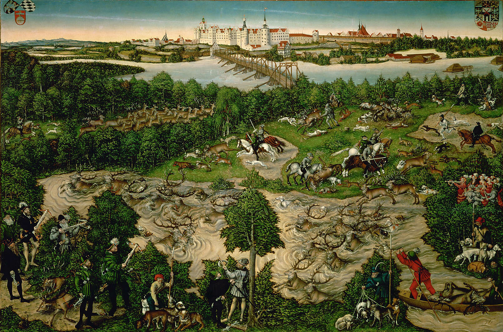 Na representação de caça ao veado ‘Stag Hunt of Elector John Frederick’ (1544) de Lucas Cranach, o Jovem [4 Outubro 1515 – 25 Janeiro 1585], a cena decorre nos arredores da cidade alemã de Torgau, nas margens do rio Elba.
