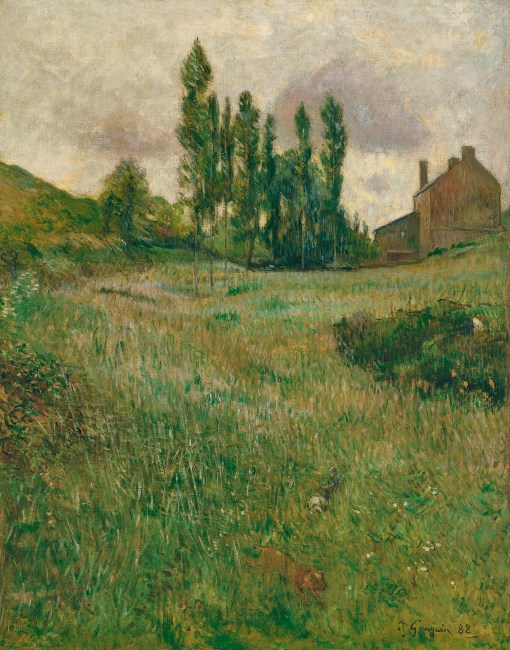 La pradera está en flor, su aspecto es primaveral, y en primer término la anima la presencia de dos perros, procedimiento habitual de Gauguin, muy aficionado a colocar algún perro en sus composiciones, ya fueran campos o playas, paisajes de Bretaña o de Tahití.