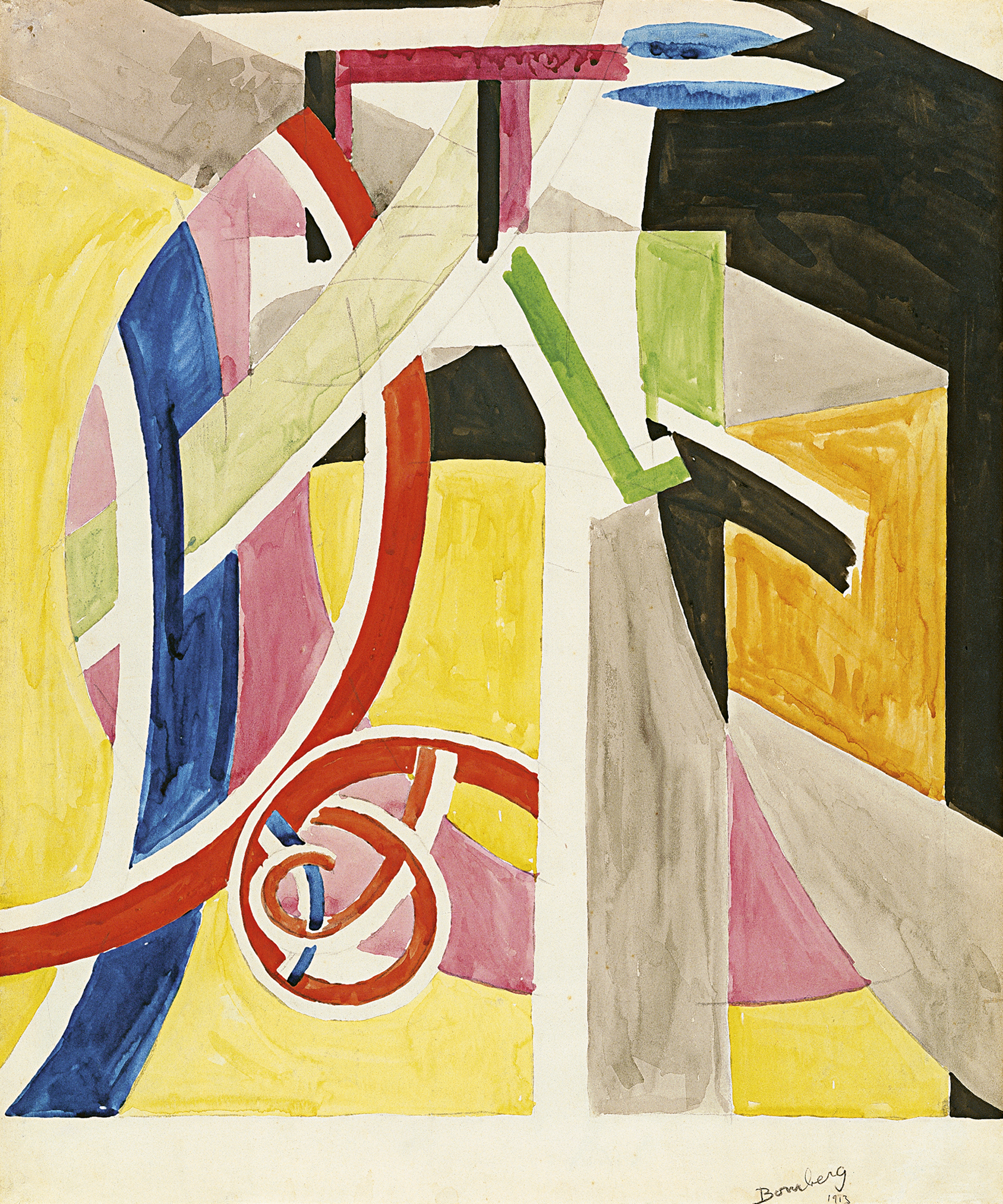 El tema de la danza, que aparece en esta composición de la colección Thyssen-Bornemisza, siempre le interesó de manera especial. Tanto las primeras actuaciones de los ballets rusos de Diághilev en Londres a partir de 1911, como su noviazgo con Sonia Cohen, una gran aficionada al baile, o el hecho de que su primera mujer, Alice Mayes, trabajara con la compañía de ballet Kosslov, influyeron sin duda en la realización de una serie dedicada a la danza entre 1913 y 1915. En esta acuarela, de líneas sinuosas, quizás una de las primeras sobre este tema, Bomberg parece explotar los ritmos del movimiento de una bailarina en el espacio y constituye un importante ejemplo del lirismo de estas tempranas abstracciones del pintor. Paloma Alarcó, Museo Thyssen.